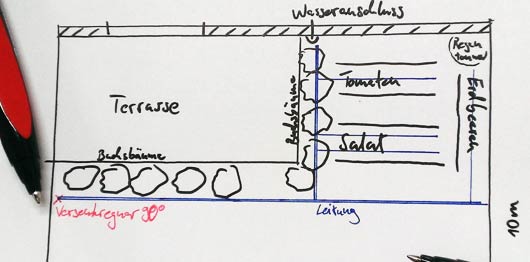Am einfachsten fertigen Sie sich eine maßstabsgetreue Skizze (1cm=1m) und zeichnen alle Wege, Terrassen, Pflanzen und zu bewässernden Flächen ein. Mit einem Zirkel werden die Versenkregner (4 m, bzw. 10 m Radius) und die Sprühstellen (z.B. 2 m Radius) der Bewässerungsanlage eingezeichnet. Bitte beachten Sie, das Pflanzen die Ausbreitung des Wassers behindern können.
